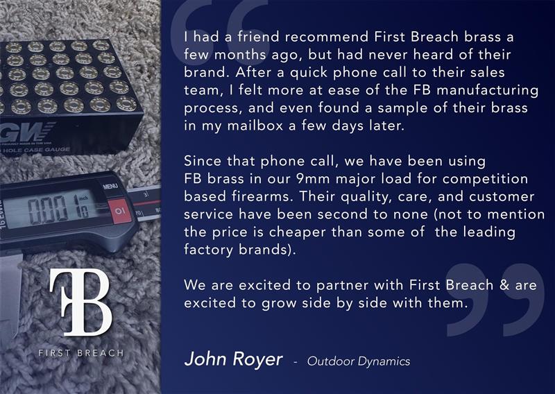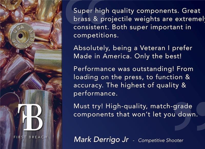 First Breach is a match-grade ammunition component manufacturer offering brass cups, brass casings, full-metal-jacket projectiles, lead projectile cores, and lead wire. We manufacture our ammo components and ammunition from scratch at our factory in Hagerstown, Maryland. Equipped with numerous quality control checks, First Breach offers world-class, match-grade, SAAMI-specification products.